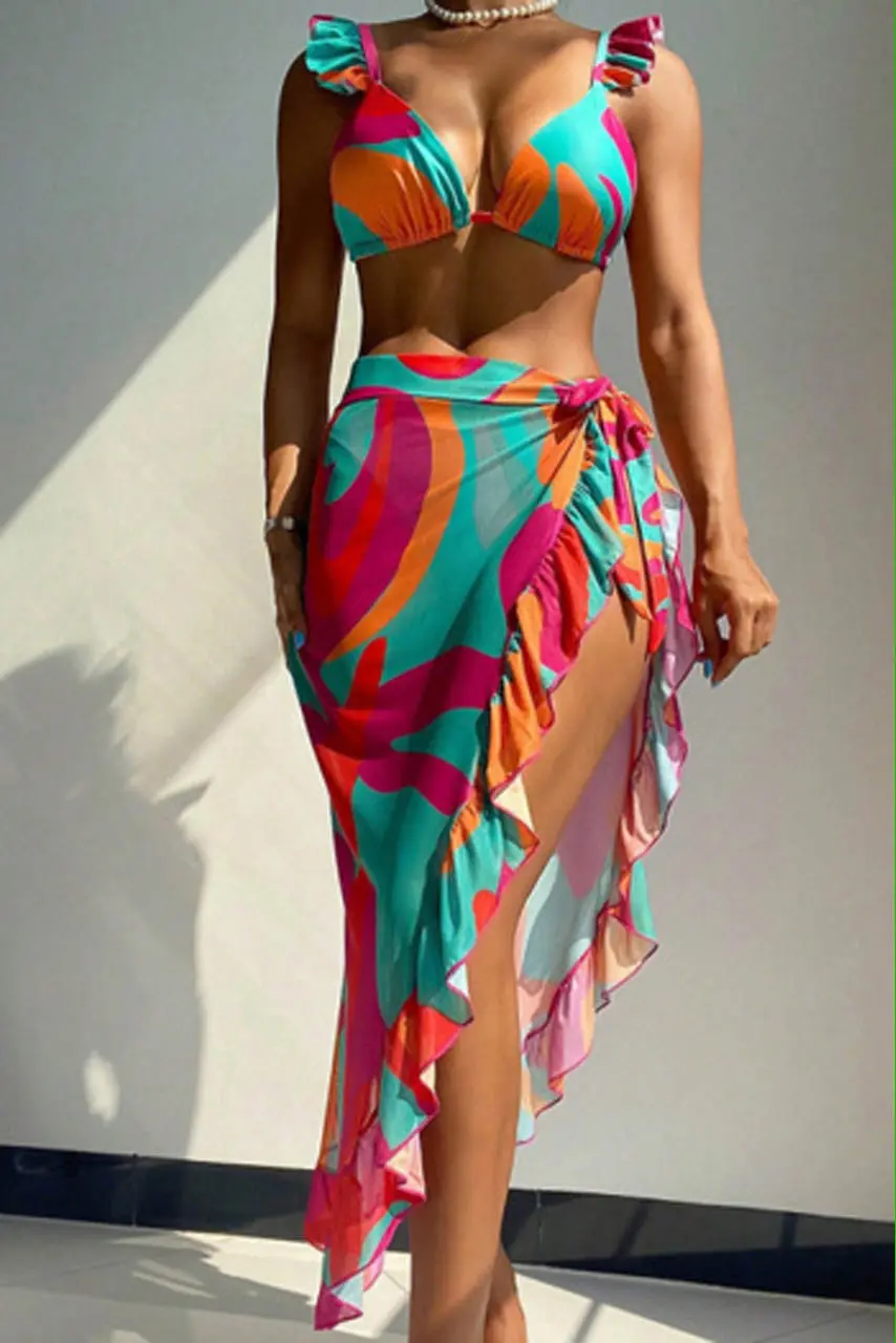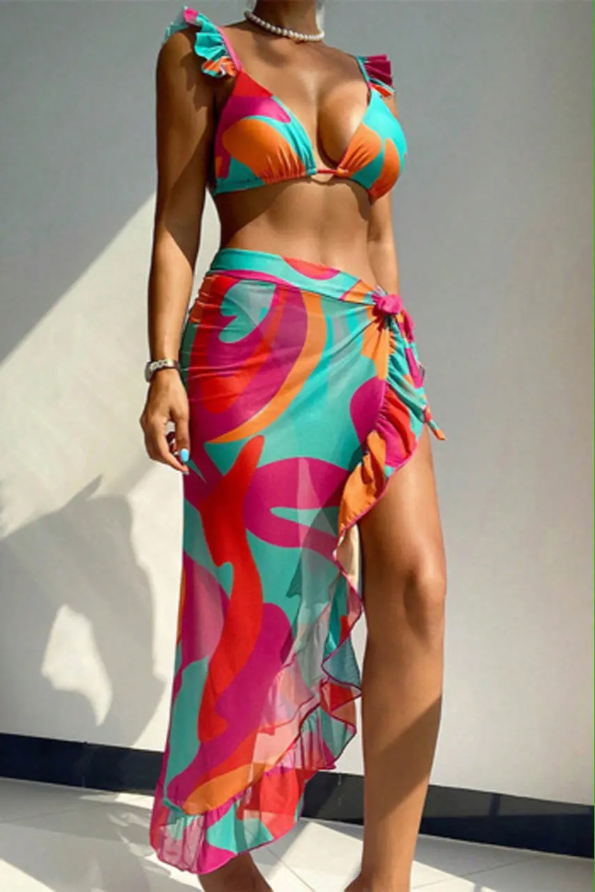 Χρώμα, όγκος και summer drama — όλα σε ένα statement σετ. Το τριπλό σετ μπικίνι με πολύχρωμο digital print και βολάν στους ώμους είναι ο απόλυτος τρόπος να κλέψεις τις εντυπώσεις στην παραλία. Το top με ενίσχυση και το παιχνιδιάρικο κόψιμο τονίζει το μπούστο, ενώ το ασύμμετρο παρεό με σκίσιμο προσθέτει αέρινη κίνηση σε κάθε σου βήμα.