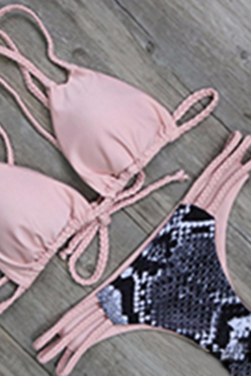 Μπικίνι τριγωνάκι σε ροζ χρώμα με λεπτομέρεια snake print στο σλιπ.