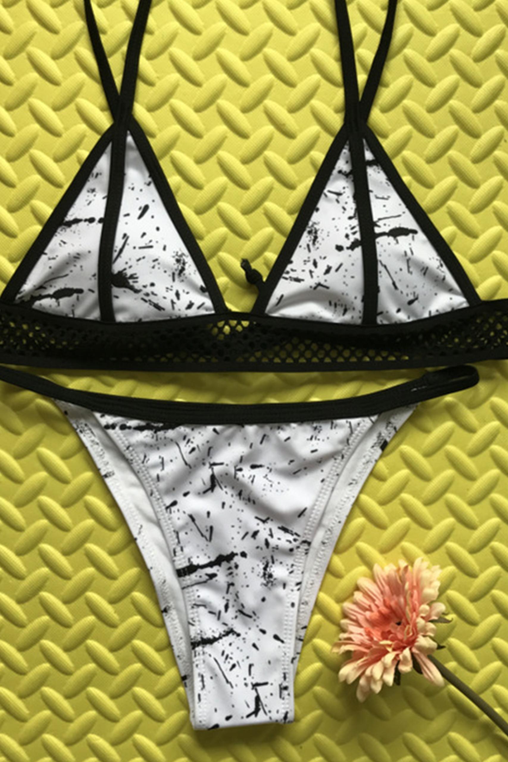 Λευκό μαύρο splash ink τριγωνάκι μαγιό με λεπτομέρεια δίχτυ στο σουτιέν.