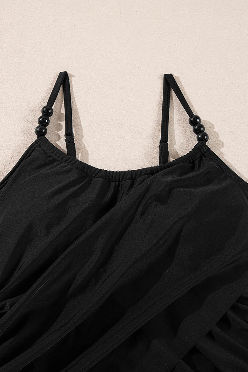 Το απόλυτο μαύρο ολόσωμο μαγιό που επαναπροσδιορίζει τη διαχρονική κομψότητα στην παραλία. Με ρυθμιζόμενες spaghetti τιράντες και κομψές χάντρες, προσθέτει μια διακριτική πολυτέλεια σε κάθε εμφάνιση. Οι στρατηγικές σούρες αγκαλιάζουν το σώμα, αναδεικνύοντας τη σιλουέτα με άψογο fit. Styling Tip: Φόρεσέ το με oversized πουκάμισο και χρυσά αξεσουάρ για ένα effortless chic beach look. Από την παραλία μέχρι το beach bar, είναι η statement επιλογή σου για το καλοκαίρι.