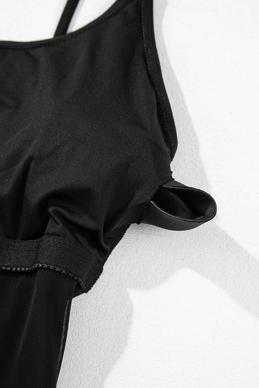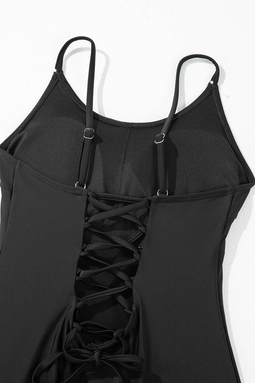 Minimal chic αισθητική με sexy details – αυτό το μαύρο ολόσωμο μαγιό με λεπτές ρυθμιζόμενες τιράντες και lace-up πλάτη είναι η επιτομή της κομψότητας και της άνεσης.